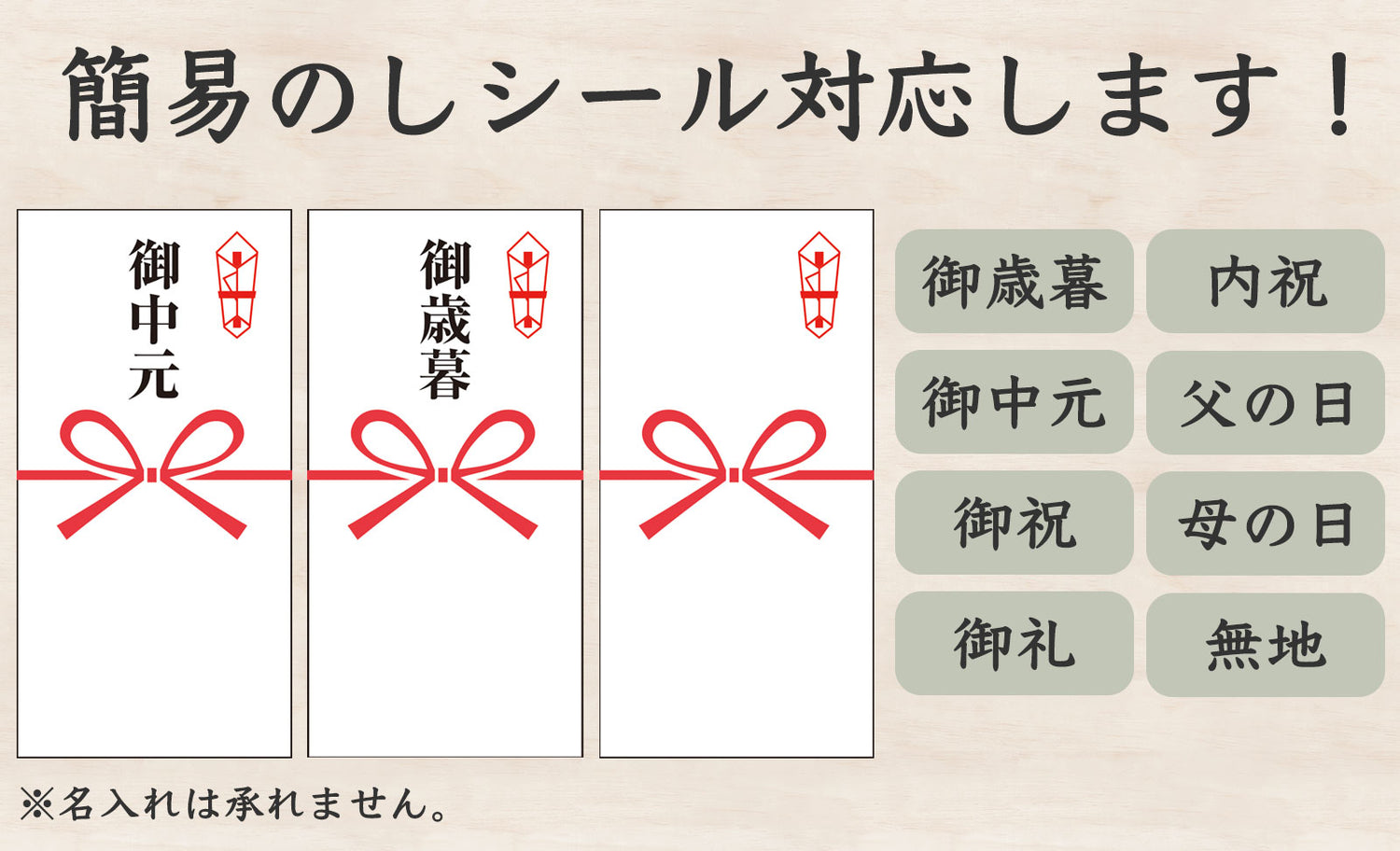 お祝いやお礼の気持ちを伝える「簡易熨斗シール」をご8種類ご用意しております。ご希望の場合はカート画面にてご選択のうえご記載ください。