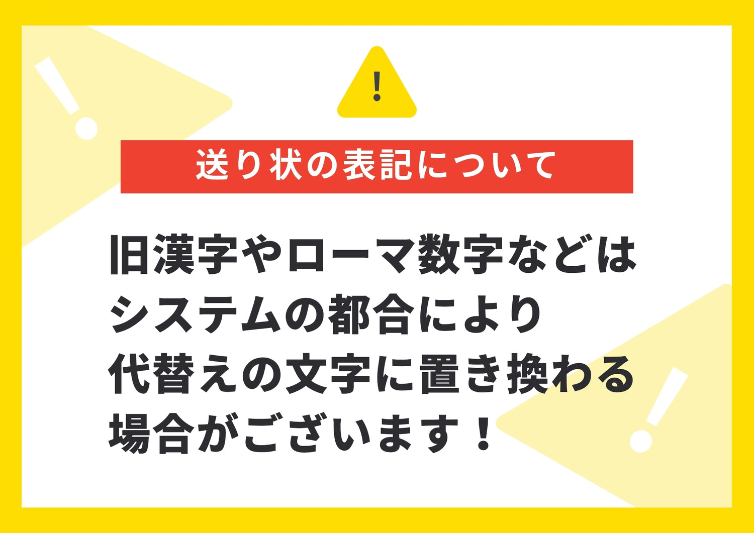 送り状のお名前やご住所の表記につきまして、システムの都合上特殊漢字やローマ数字等の表記はご入力通り送り状に反映できない場合があります。その場合は代替えの文字にて表記されますこと、あらかじめご了承くださいませ。(例:「﨑」→「崎」、「髙」→「高」、「Ⅵ」→「6」)