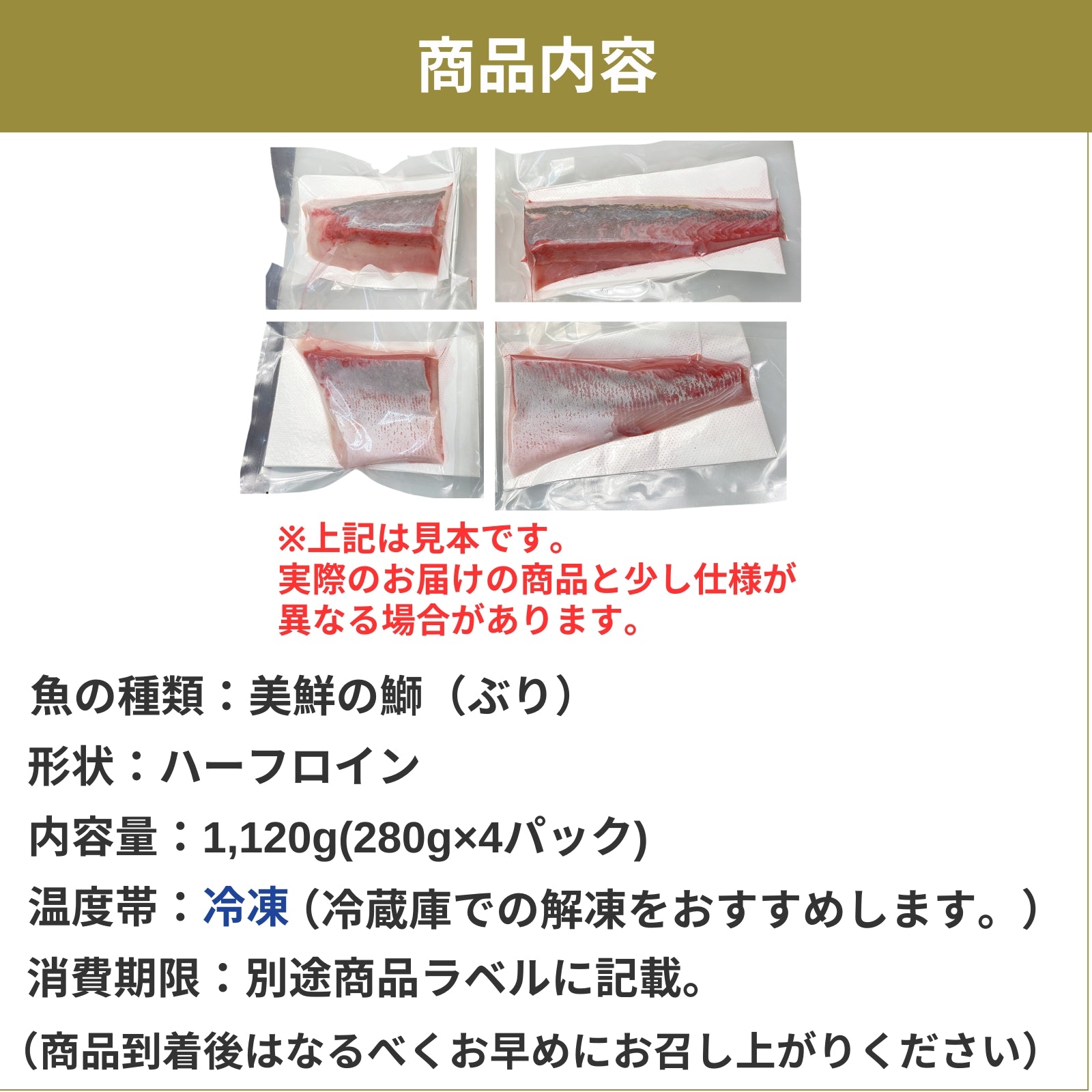 【愛媛のブランド鰤 美鮮の鰤】ハーフロイン 1,120g(280×4パック)|ポリフェノールで鮮度長持ち!|産地直送|冷凍便 【No.03】