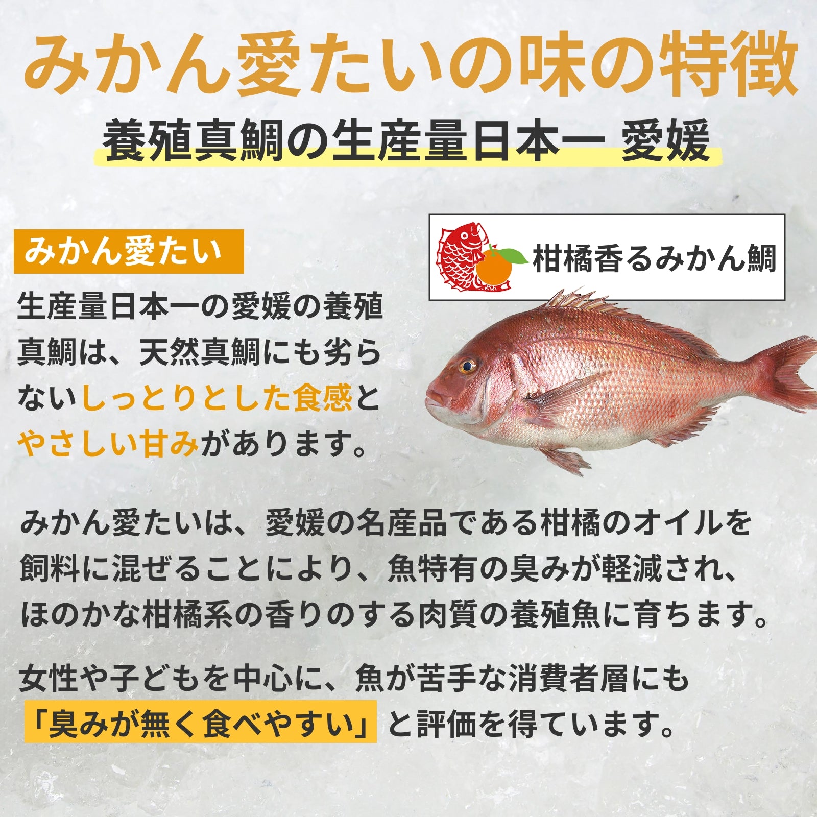 この最高の環境に加え、柑橘の成分(リモネン)が身の色を美しく保ち、鮮度の持続にも貢献。まさに愛媛の自然と知恵が詰まった一級品です。